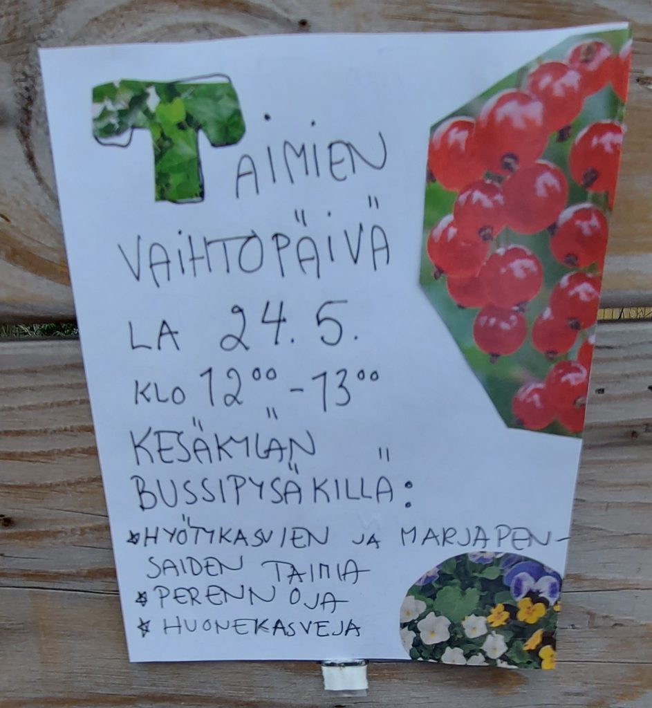 Tervetuloa viettämään kanssamme taimien vaihtopäivää la 24. toukokuuta klo 12:00-13:00 Kesäkylän kääntöpaikalle bussipysäkin tienoille.