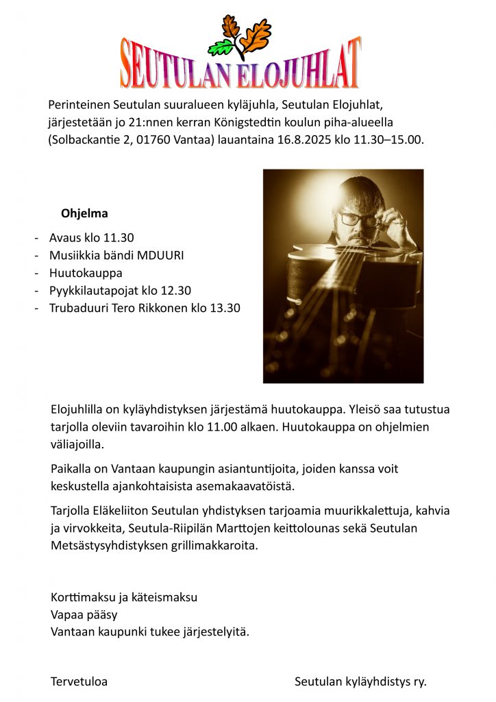 Yleinen Seutulan Elojuhlat 16.8. 11:30 – 15:00 Königstedtin koululla 11.8.2025 by webmaster Artikkelien selaus Kesäkylä Koivikko Oy:n varsinainen yhtiökokous Lauantaina 28.6.2025 kello 12:00 Königstedin koulullaTalkoot 20.9 kello 10:00 leikkikentällä